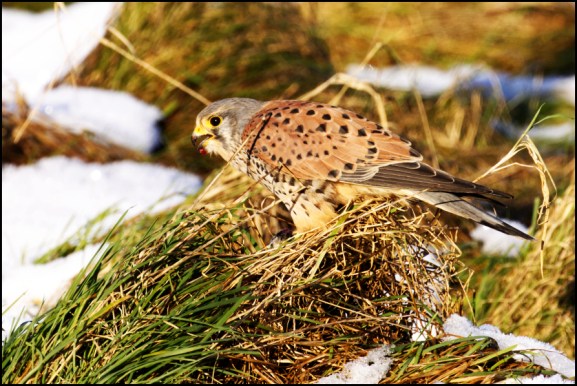 Hawling Two male Kestrels seen with vole prey in snowy fields this afternoon. (Roger Wasley).