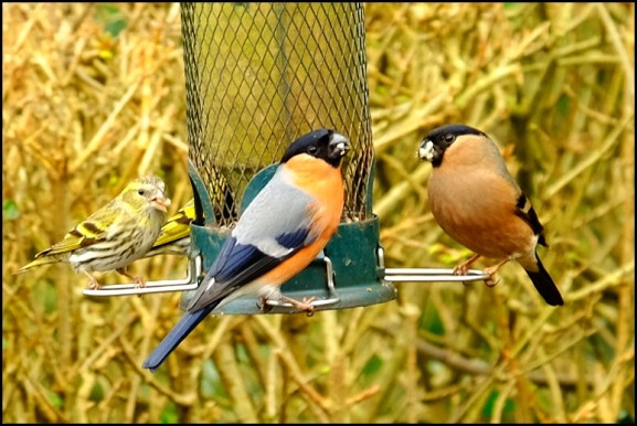 Forest of Dean A pair of Siskins and a pair of Bullfinches at Lydbrook this morning. (Wes Hayfield).