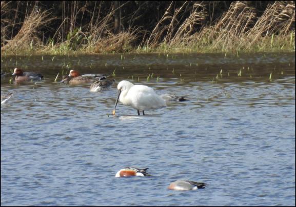Coombe Hill Meadows This morning two drake GARGANEYS from Grundon hide. (Greg Mabbett/Les Ditchburn). This evening a pair of GARGANEYS from Grundon hide, so definitely three birds on site today. (Jeremy Holland). An adult SPOONBILL from 1:20pm. (MK). Also a Dunlin, a Redshank, two Oystercatchers, 215 Black-tailed Godwits, a Little Egret and this evening a Goshawk caught and killed a Coot. (Ian Ralphs/Jeremy Squire/Steve Huggins).