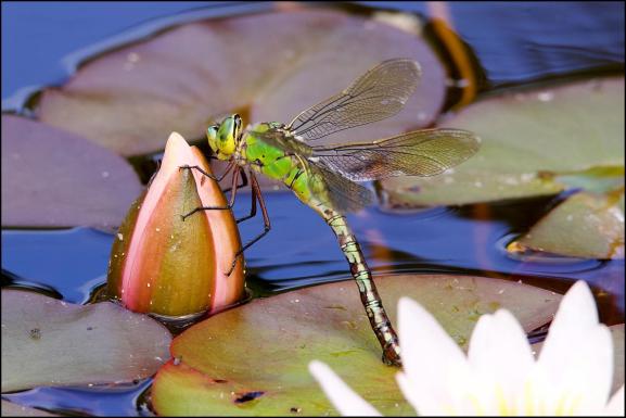 Gretton A female Emperor dragonfly laying eggs on a lily in the garden pond this afternoon. (Roger Wasley).
