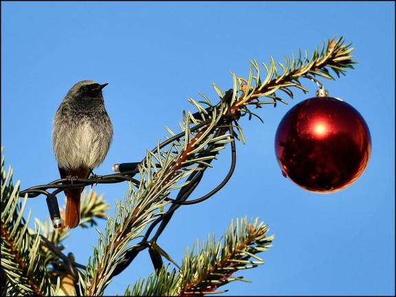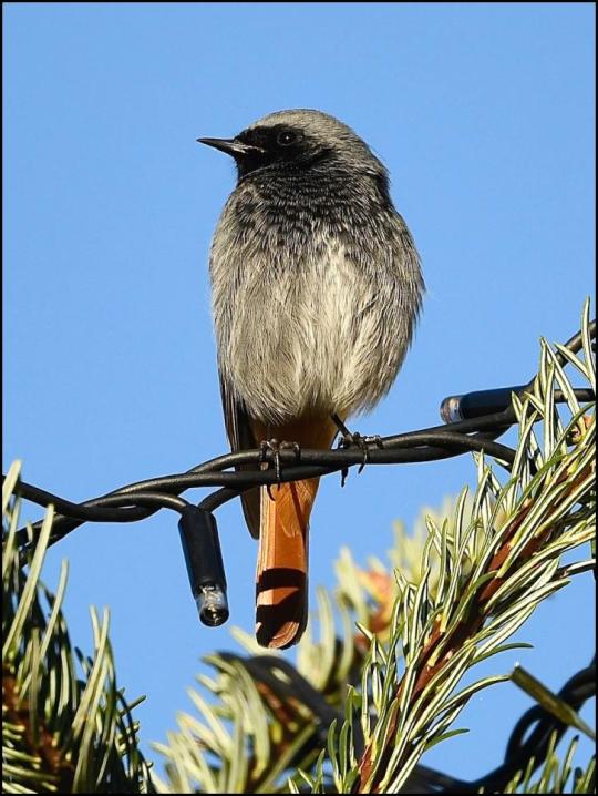 Gloucester The male BLACK REDSTART at the Cathedral was in the College Green Christmas tree today. (Graham Cox).