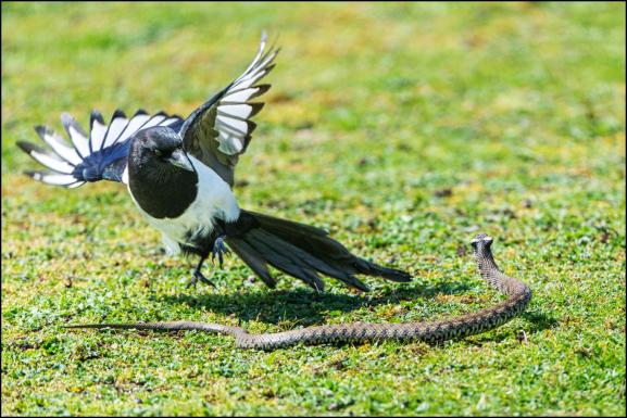 Lydney Harbour This afternoon two Magpies attacking a Grass Snake. The snake got away. (Eden Tanner).
