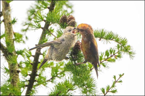 This afternoon at Woorgreens a pair of Crossbills feeding three fledglings. (Eden Tanner).