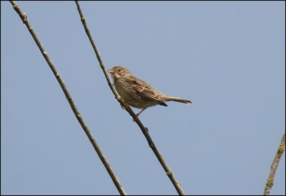 Slimbridge village A CORN BUNTING with a male Yellowhammer at 51.7332228, -2.3863473 today, a great local bird. On a barn with a dipped terracotta tile roof on the left in the village. (Jack Green).