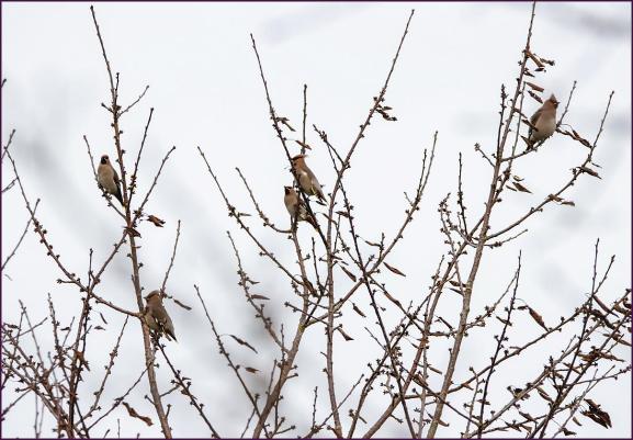 Bussage Late morning six WAXWINGS feeding and preening but disturbed by crows and flew off. (Mike Hudson).