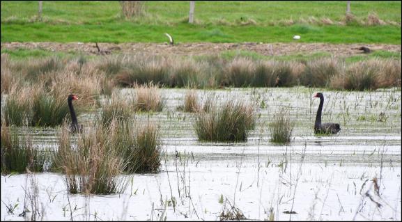 Saul Warth This morning two Black Swans, first here since 2008, five Mute Swans, a pair of Gadwalls, three Mallards, 17 Shelducks, a pair of Greylags, a pair of Canada Geese, 12 Coots, two Little Egrets and 82 Curlews. Also five Chiffchaffs, four Skylarks and a Blackcap singing in Dunstalls Wood. (MK).