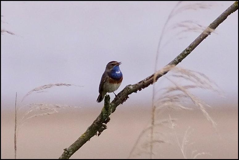 WWT Slimbridge The WHITE-SPOTTED BLUETHROAT showed well at Middle Point this morning. Also a Marsh Harrier here. From Zeiss hide a pair of Common Cranes with chicks. (Heather England/Rachel Thomas).