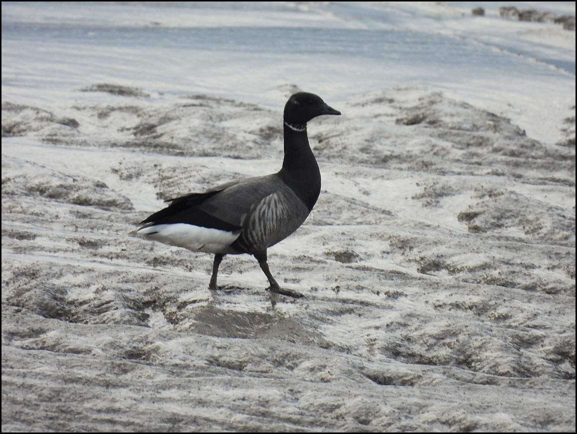 Saul Warth At high tide at dawn in icy conditions a close Dark-bellied Brent Goose until 11am at least, seven Shelducks, seven Lapwings, 90 Curlews, 100 Dunlins, four Fieldfares, a Chiffchaff and a Little Egret and 11 more opposite Dunstalls Farm on the Arlingham Road. (MK).