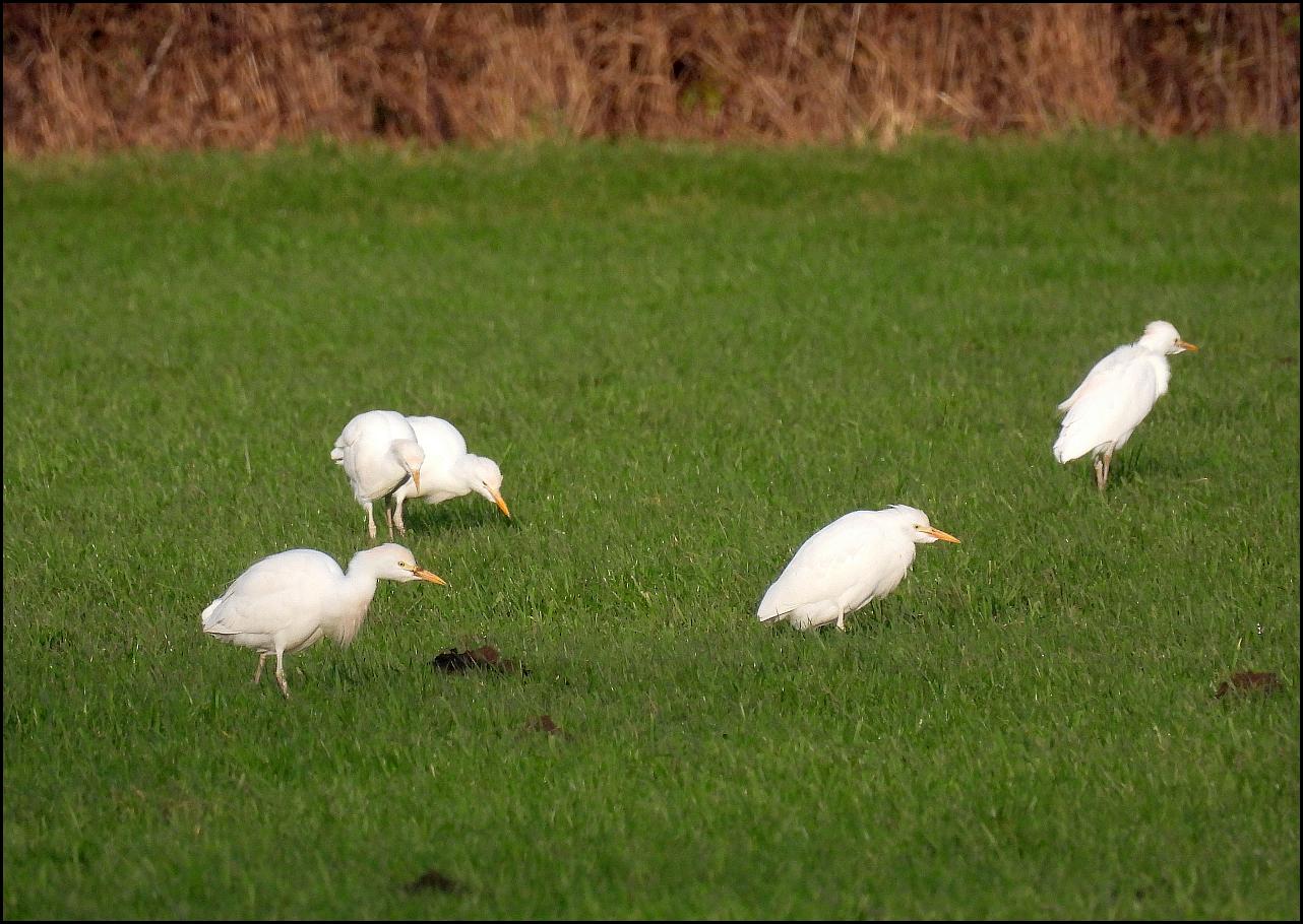 Saul Warth At high tide early afternoon 15 Shelducks, two Curlews, a Kestrel, 25 Pied Wagtails, 20 Fieldfares, 12 Redwings, 18 Chaffinches and ten Skylarks. 30 Cattle Egrets and 18 Little Egrets opposite the parking at the Fretherne end of Hock Ditch. (MK).