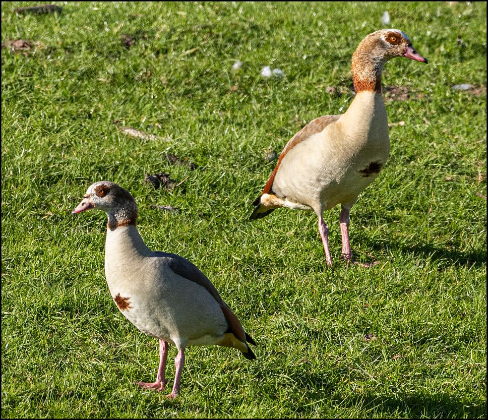 Ashleworth Ham Five Egyptian Geese seen from the Ham Road at the entrance to Stonebow Farm on the grassy bank of the small farm pond. From the GWT hide this afternoon 41 Teal, eight Tufted Ducks, six Wigeon, 32 Mallards, five Shovelers, four Pintails, four Gadwalls, two Shelducks, nine Mute Swans, two Canada Geese, three Greylags, three Coots, a Moorhen, seven Lapwings, three Grey Herons, two Little Egrets and a Great Spotted Woodpecker. (John Fletcher).