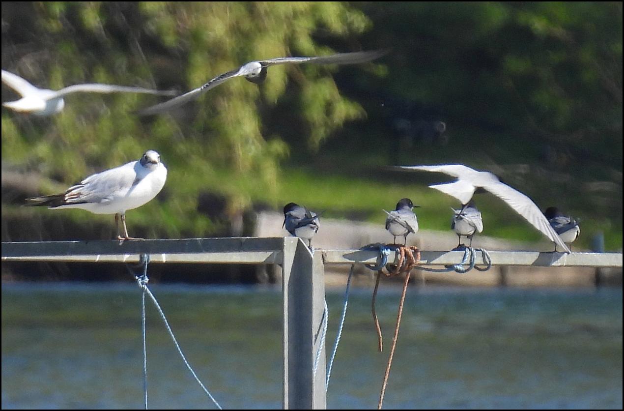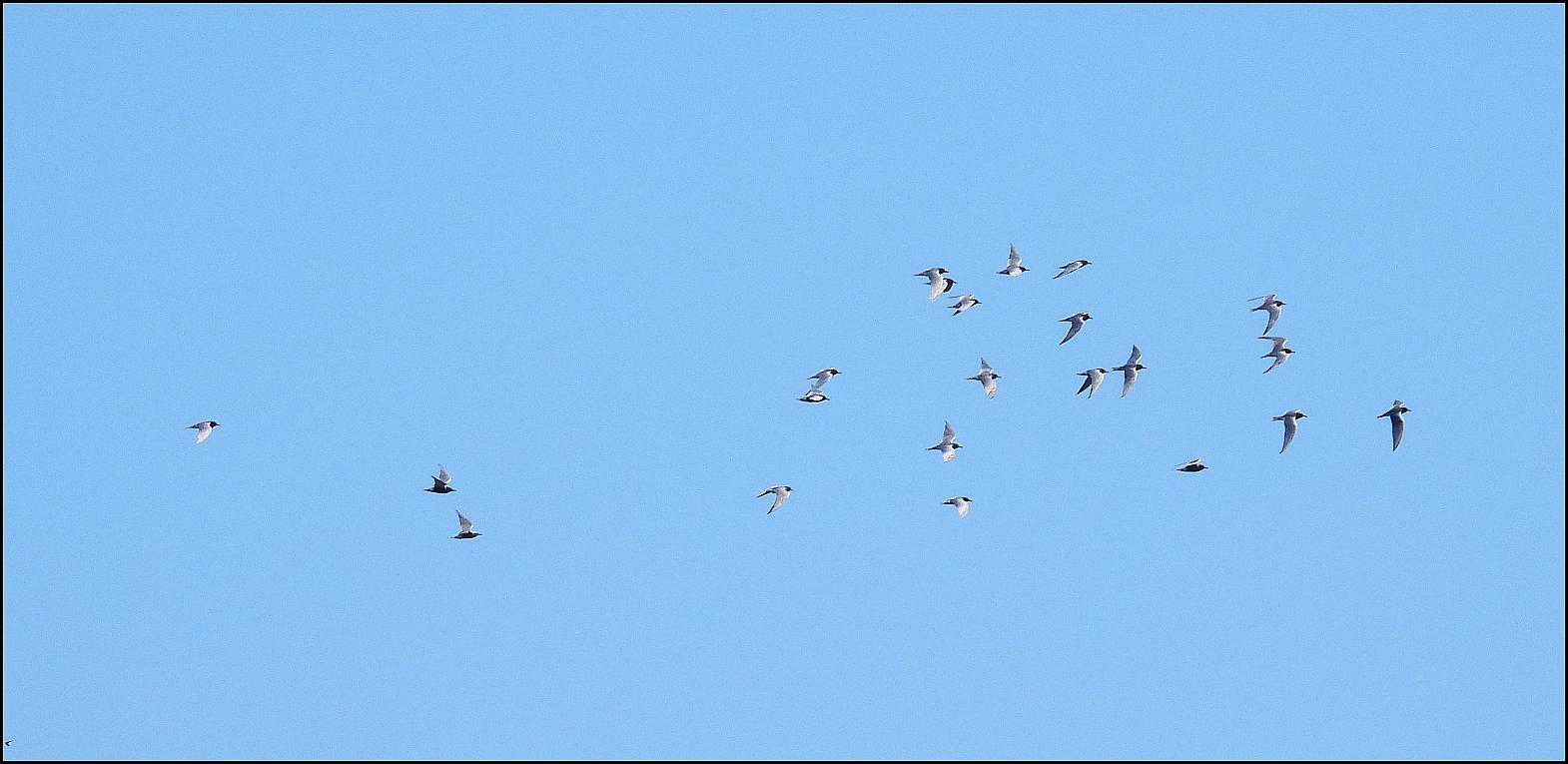 Frampton 22 BLACK TERNS on the sailing lake from late morning until 7:35pm when they flew off high NE. (Neil Sumner). Also two HOBBIES, a Common Sandpiper, a Cuckoo, three Swifts and the Black Swan still. (Ian Ralphs/Mark Dowie/Nick Goatman/MK).