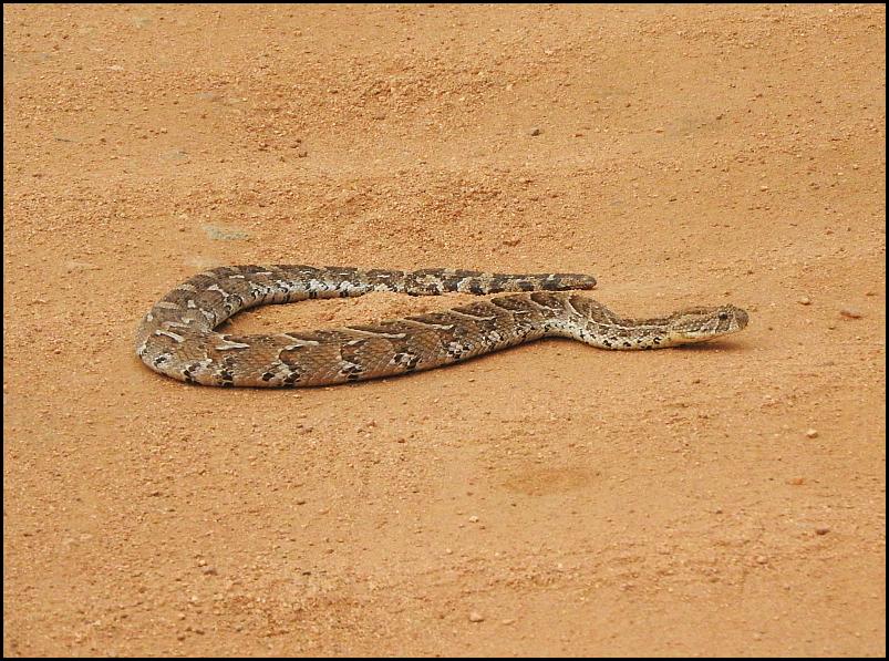 Early afternoon it was back to Kruger with Drikus. We stopped on the Sabie River bridge just before Paul Kruger Gate. There was a Hippo sleeping and an AFRICAN BLACK SWIFT was flying around with four African Palm Swifts. Just inside the gate we stopped and had nice views of a Brown Snake Eagle. We passed an old one-eyed Chacma Baboon and a large number of Impalas, a sleeping Lion and then stopped for a PUFF ADDER crossing the road, which was the best sighting of the afternoon, unless you were Bridgette.