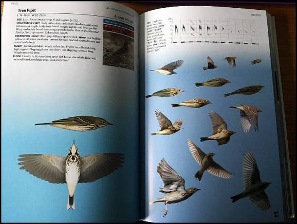 This is a real cutting-edge guide and should help with the difficult skill of identifying flying passerines. For each species there are concise descriptions covering Size, Structure and Shape, Colouration, Flight, and flock details. Also, a written description of the calls with a sonogram. Each species is illustrated by Tomasz, with a range of flight photos on the facing page. A sample page is below.
